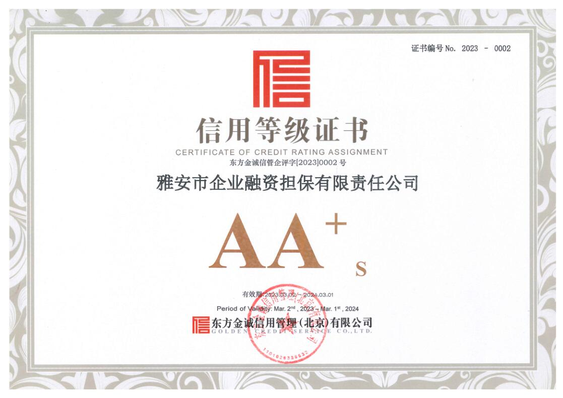 3月3日,雅安市企業(yè)融資擔(dān)保有限責(zé)任公司(以下簡稱“市擔(dān)保公司”)傳來喜訊,經(jīng)東方金誠信用管理(北京)有限公司通過對(duì)市擔(dān)保公司的信用狀況進(jìn)行綜合分析和評(píng)估,確定該公司信用等級(jí)為AA+。
